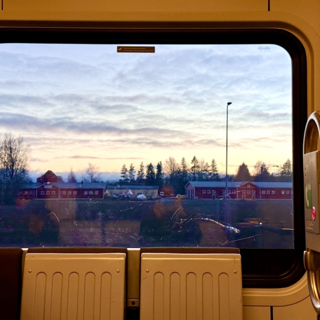 @skeyby A view through a train window, framed by the dark interior of the train car. The window is rectangular with rounded corners and a dark border. Outside the window, a landscape stretches into the distance, featuring a row of trees and a series of buildings. A long, low structure with multiple windows is visible, likely another train or a long building, running parallel to the tracks. The sky is overcast with gray and white clouds, suggesting dusk or dawn. The seat in front of the window is gray and appears to be made of plastic or a similar material.